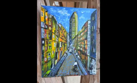 Akrylmaleri "I byen", højde 50 cm, bredde 40 cm.